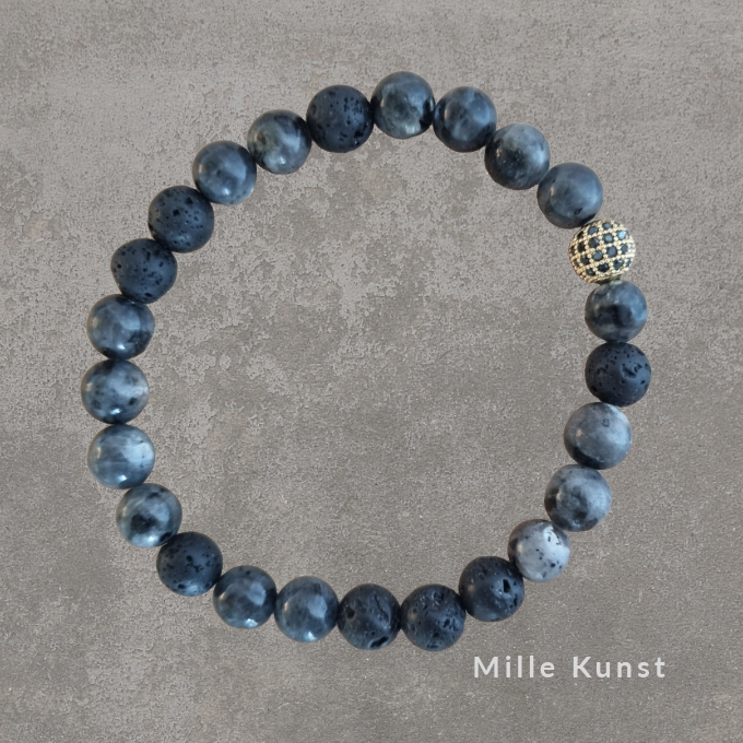 Armbånd i et mix af 8mm perler og forgyldt rhinstenskugle.Lava og larvikit.Kun 1 på lager. Ønsket størrelse noteres i kommentarfeltet ved afslutning af bestilling.(Håndledsmål - tæt mål, men ikke stramt).